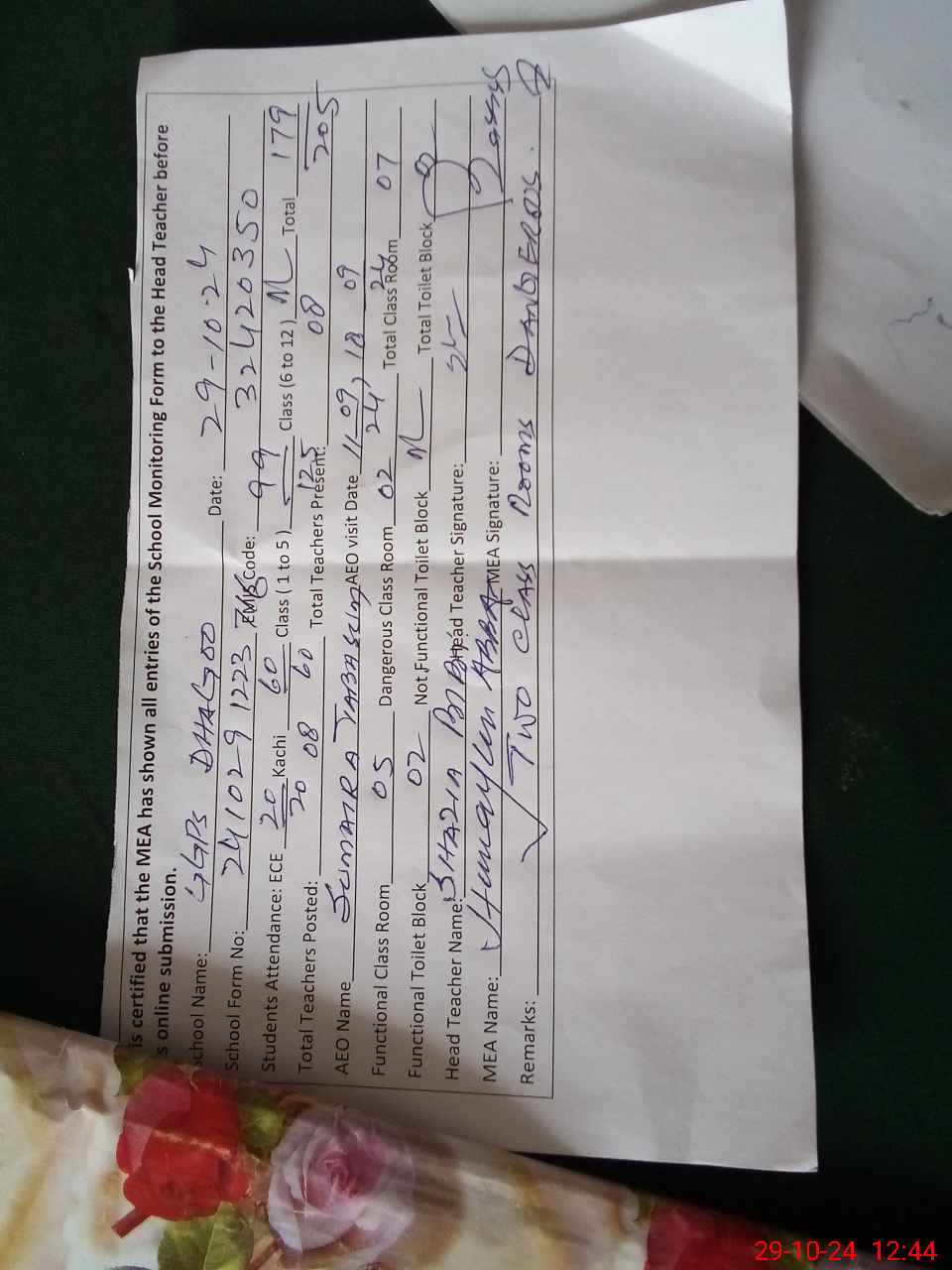 | Certified that this School was Inspected by the Undersigned MEA/DMO Today and the Information Stated Above is as Per Record. | |||||