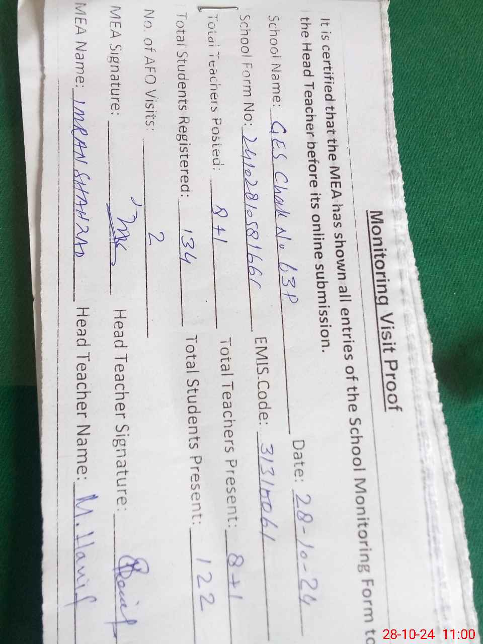 | Attendance Register | Head Teacher | MEA with School | Visit Proof |