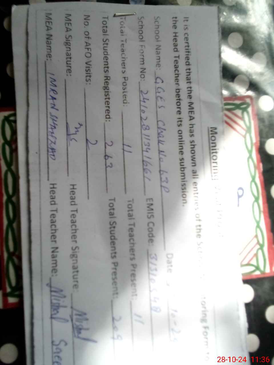 | Certified that this School was Inspected by the Undersigned MEA/DMO Today and the Information Stated Above is as Per Record. | |||||