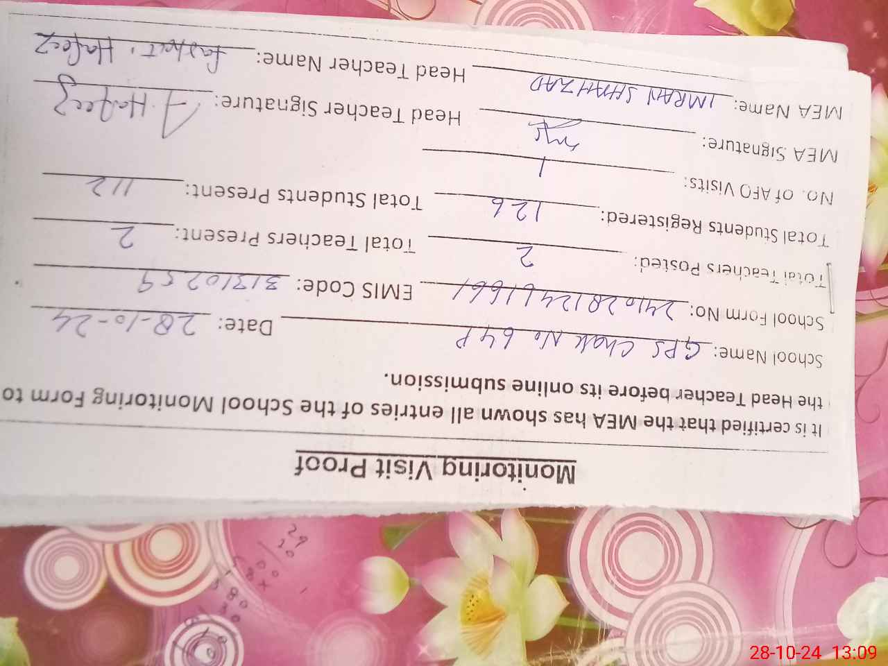| Attendance Register | Head Teacher | MEA with School | Visit Proof |