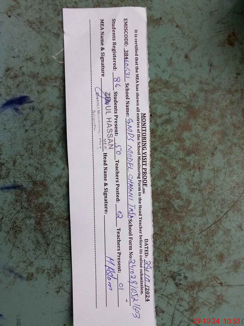 | Monitoring Date: 29-10-2024 | Start Time: 29-10-2024 10:28 AM | End Time: 29-10-2024 10:55 AM | Name of MEA: ZI**** ULHA**** | |