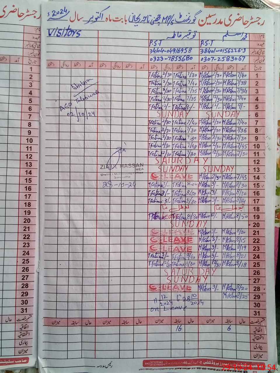 | Leave | Duty | Absent | Maternity | Medical | Ex- Pak |