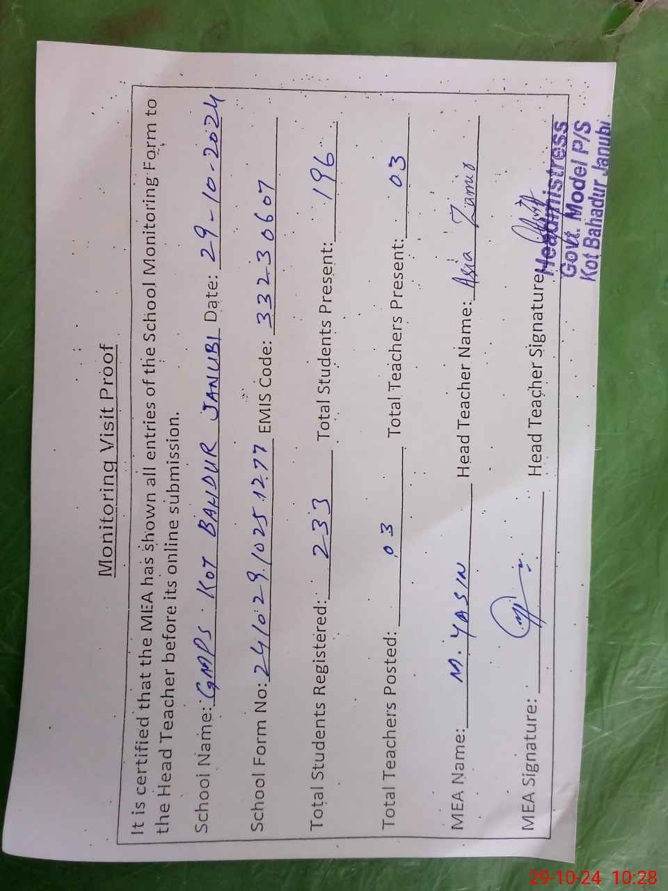 | EMIS Code: 33230607 | Name of School: GMPS KOT BAHADUR JANUBI | |||