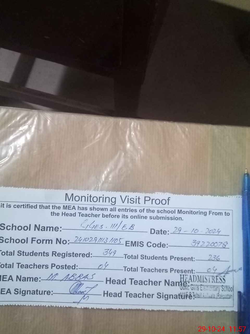 | Attendance Register | Head Teacher | MEA with School | Visit Proof |
