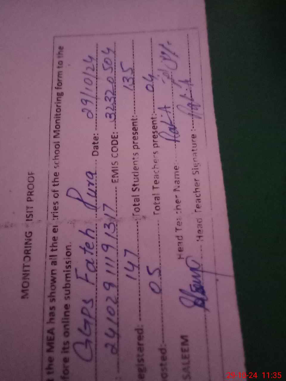 | Attendance Register | Head Teacher | MEA with School | Visit Proof |