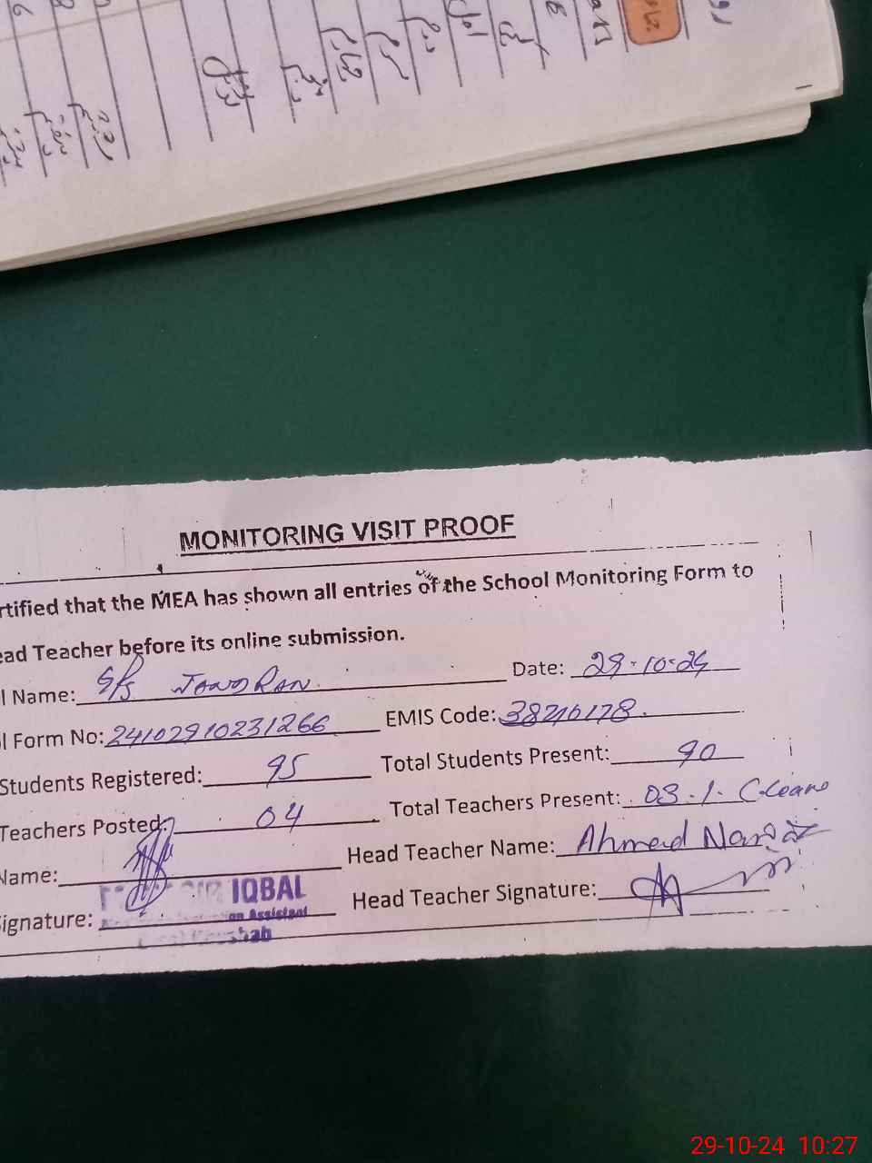 | Attendance Register | Head Teacher | MEA with School | Visit Proof |