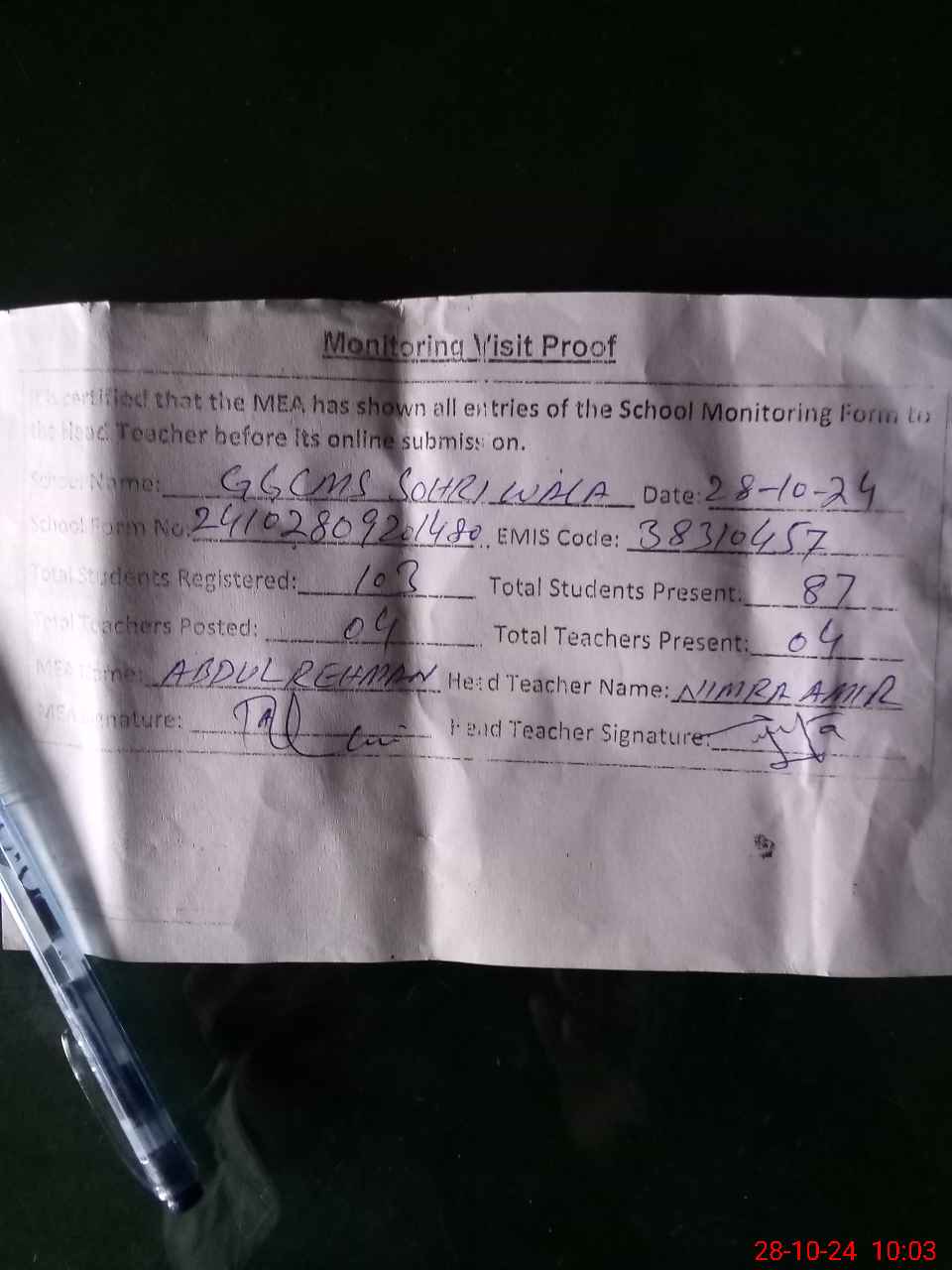 | Attendance Register | Head Teacher | MEA with School | Visit Proof |