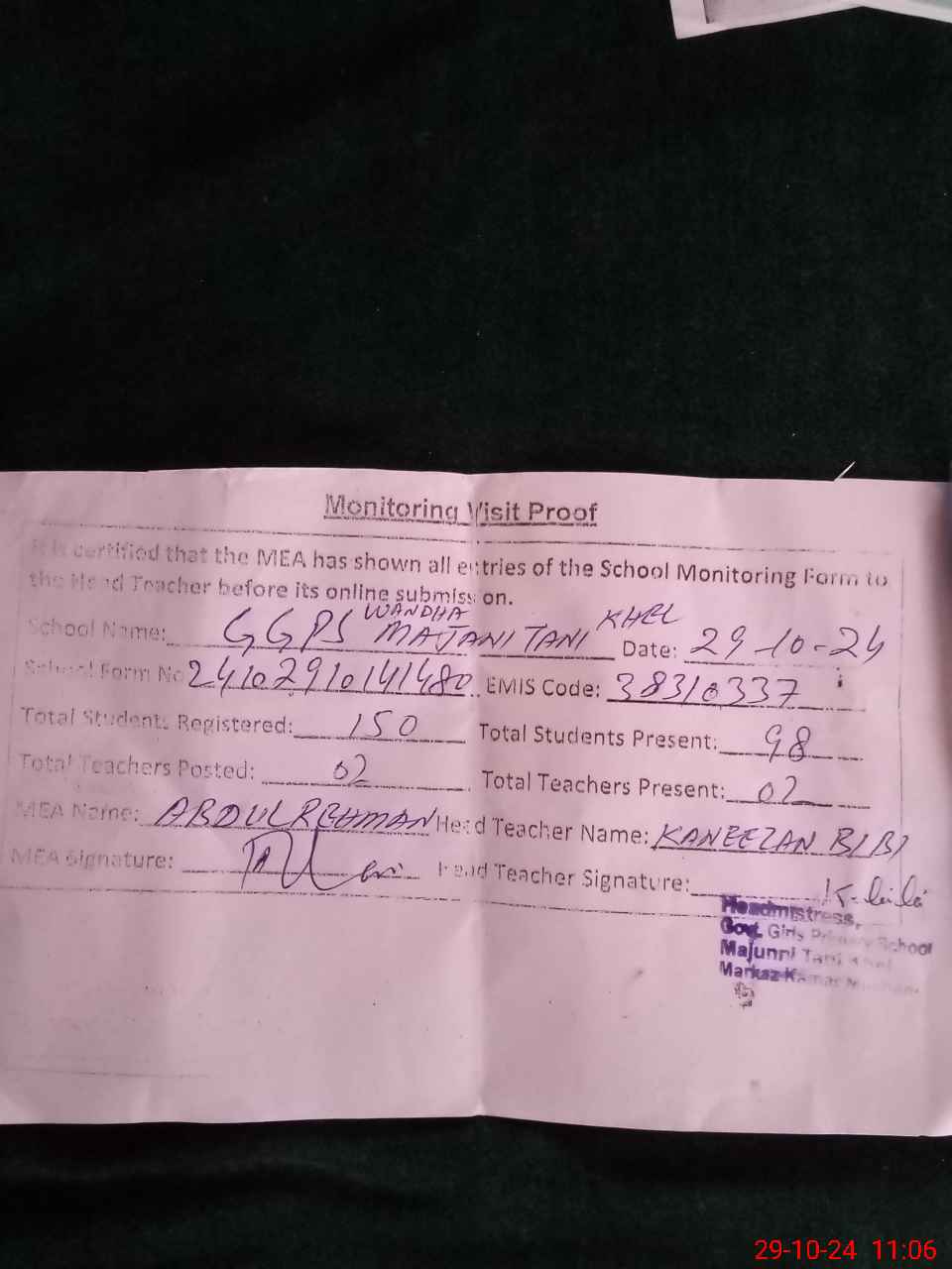 | Certified that this School was Inspected by the Undersigned MEA/DMO Today and the Information Stated Above is as Per Record. | |||||