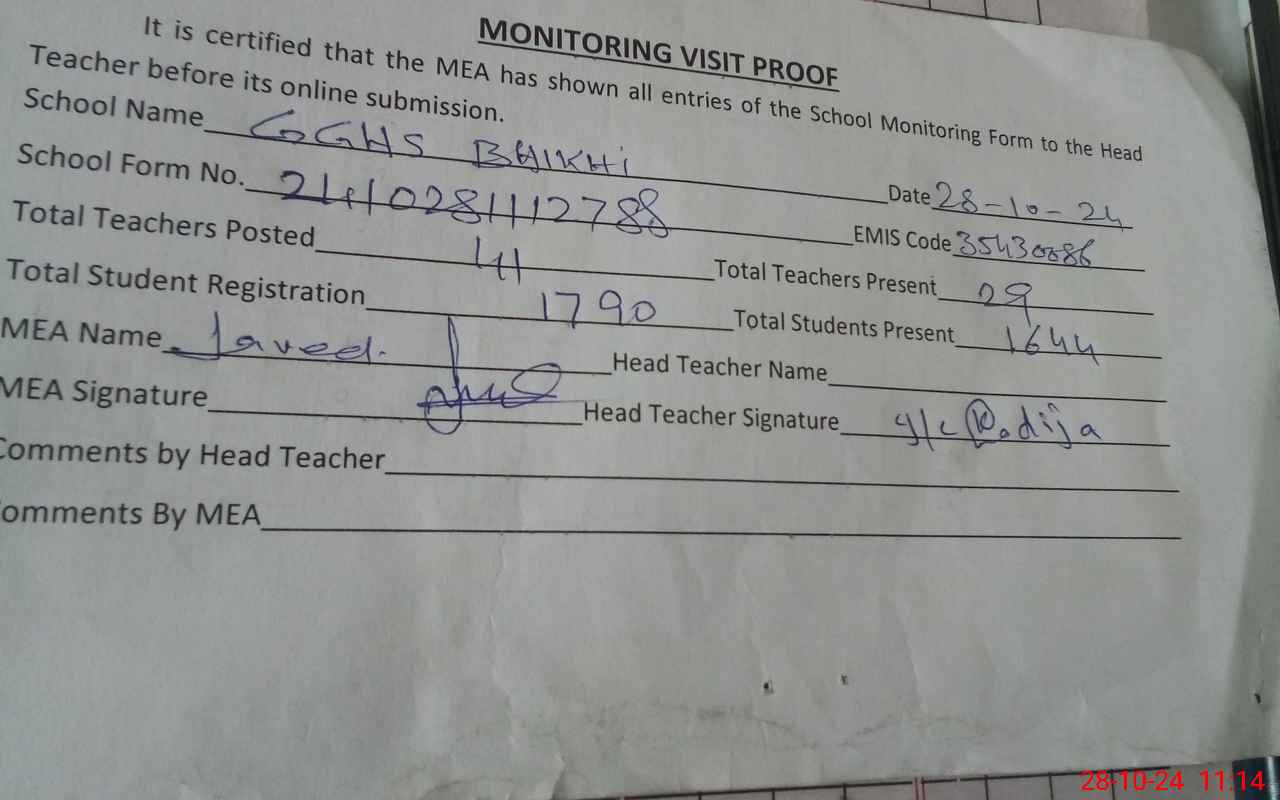 | Certified that this School was Inspected by the Undersigned MEA/DMO Today and the Information Stated Above is as Per Record. | |||||