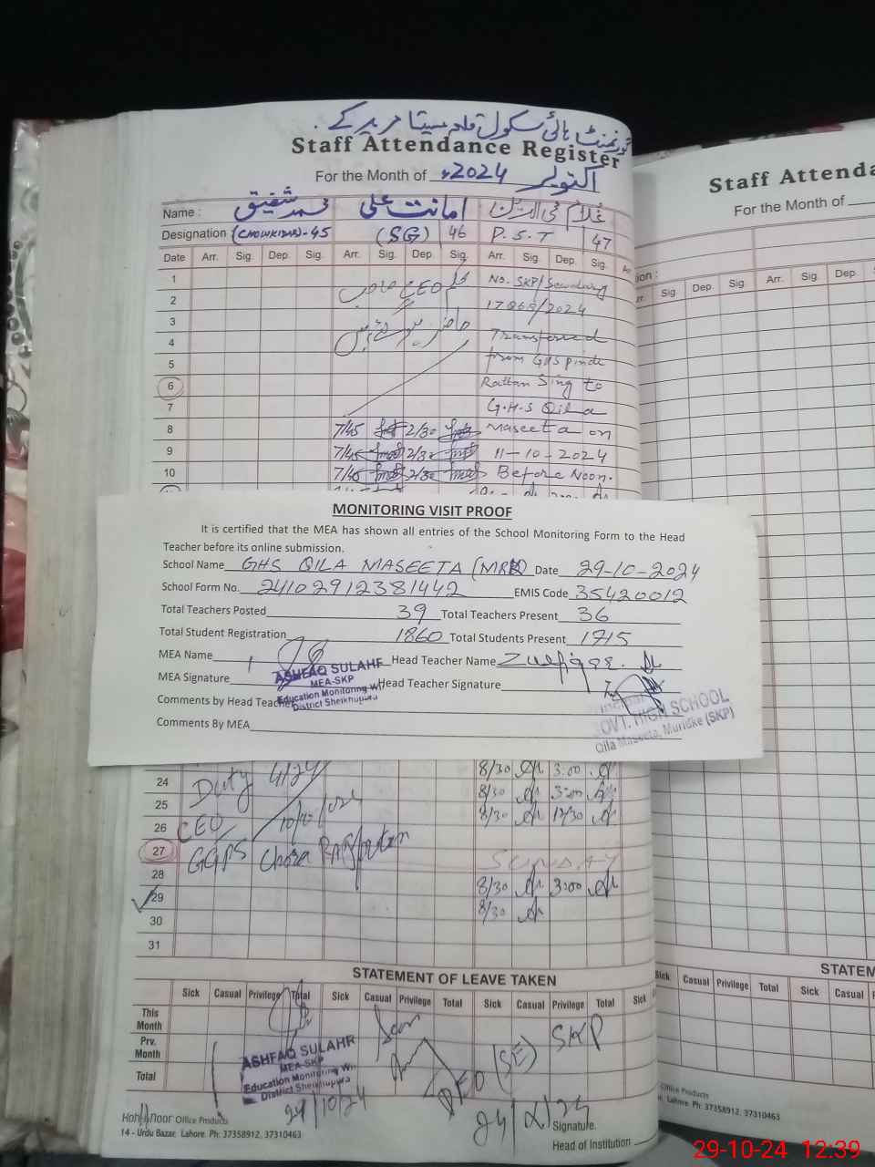 | Attendance Register | Head Teacher | MEA with School | Visit Proof |