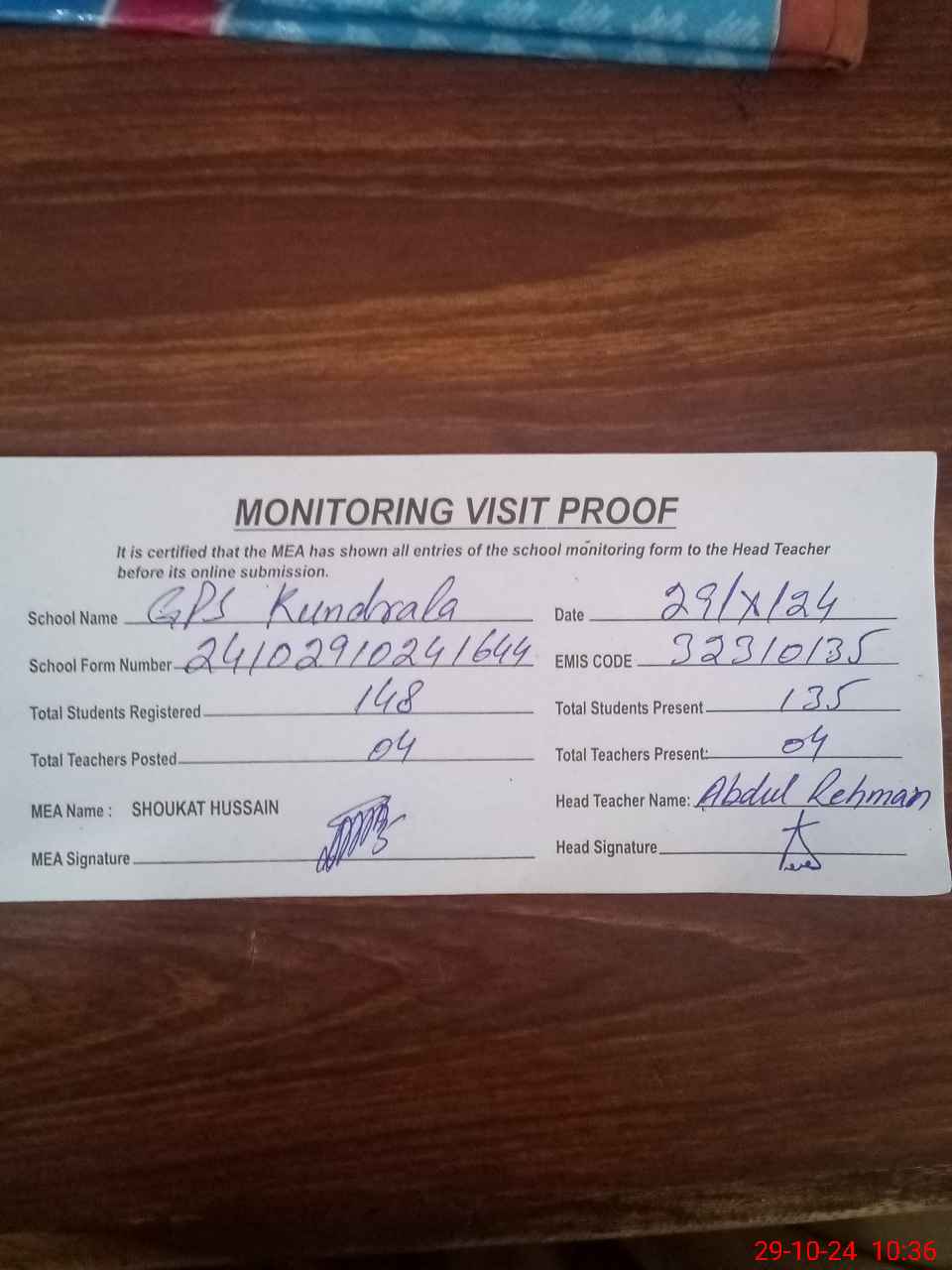 | Attendance Register | Head Teacher | MEA with School | Visit Proof |