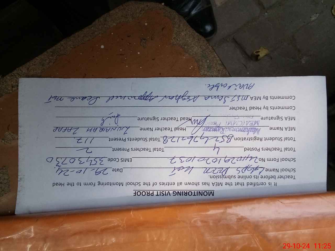 | Attendance Register | Head Teacher | MEA with School | Visit Proof |