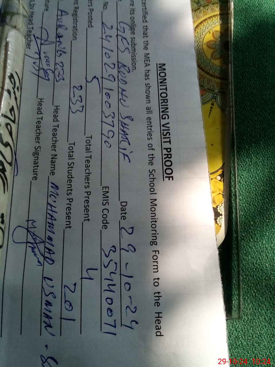| Attendance Register | Head Teacher | MEA with School | Visit Proof |