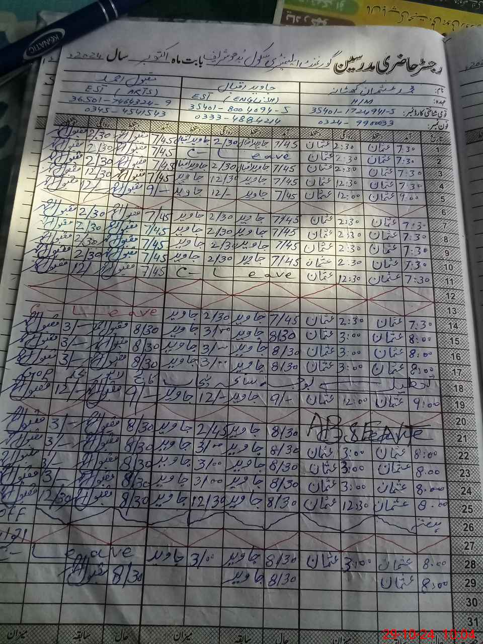 | Leave | Duty | Absent | Maternity | Medical | Ex- Pak |