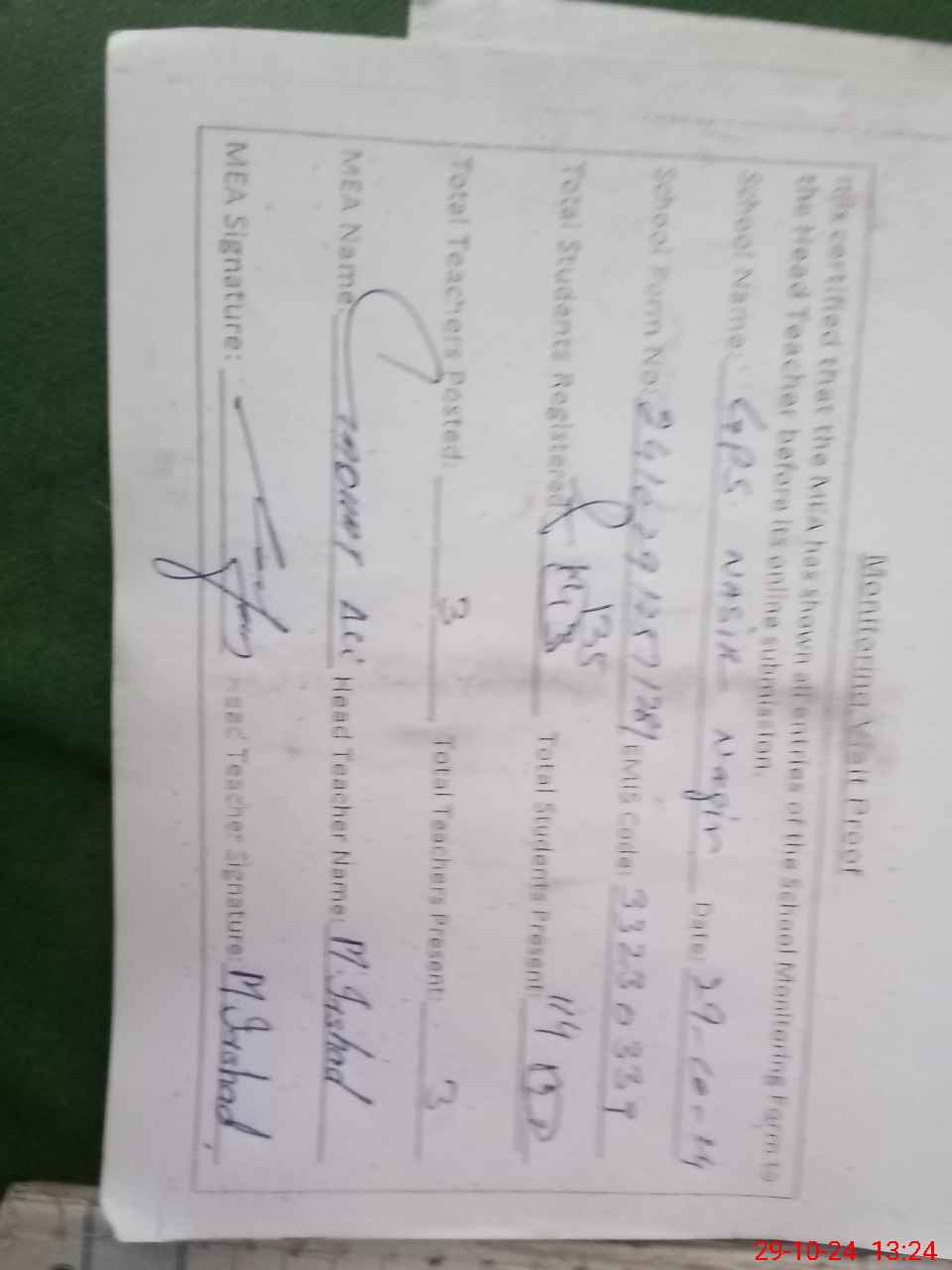 | Attendance Register | Head Teacher | MEA with School | Visit Proof |