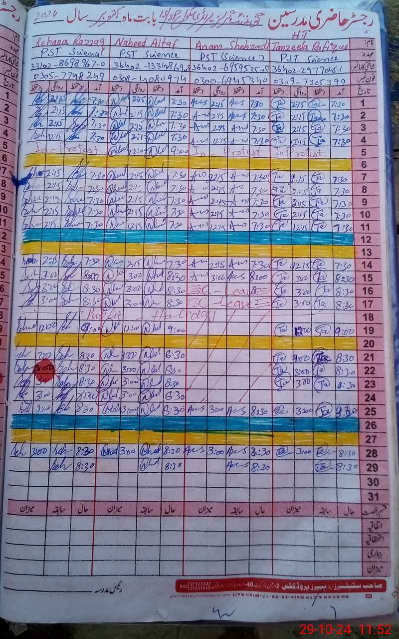 | CNIC | Full Name | Designation | R/C | Absence During Last Calender Month |