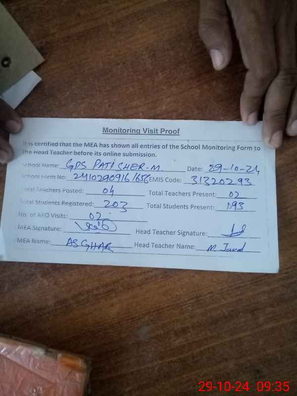 | EMIS Code: 31320293 | Name of School: GPS PATI SEHR MUHAMMAD | |||