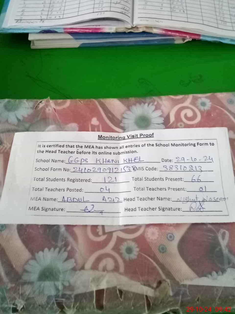 | Attendance Register | Head Teacher | MEA with School | Visit Proof |