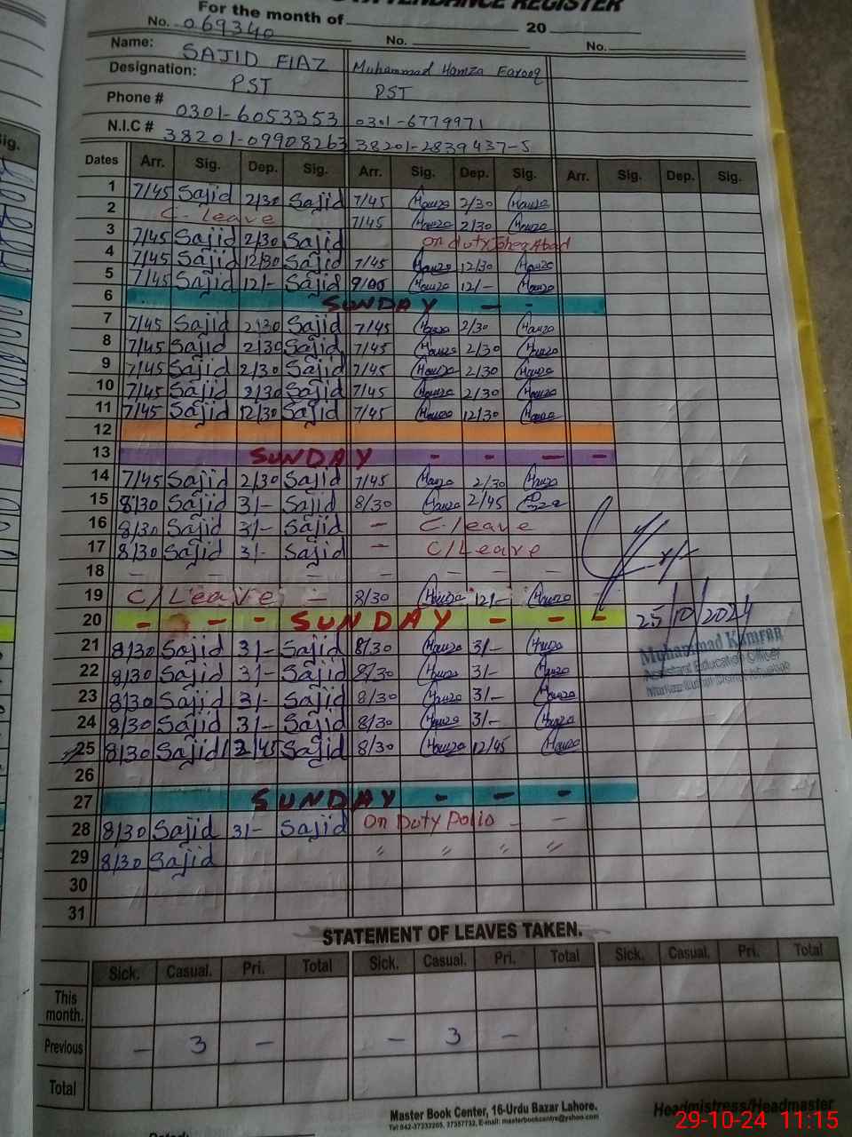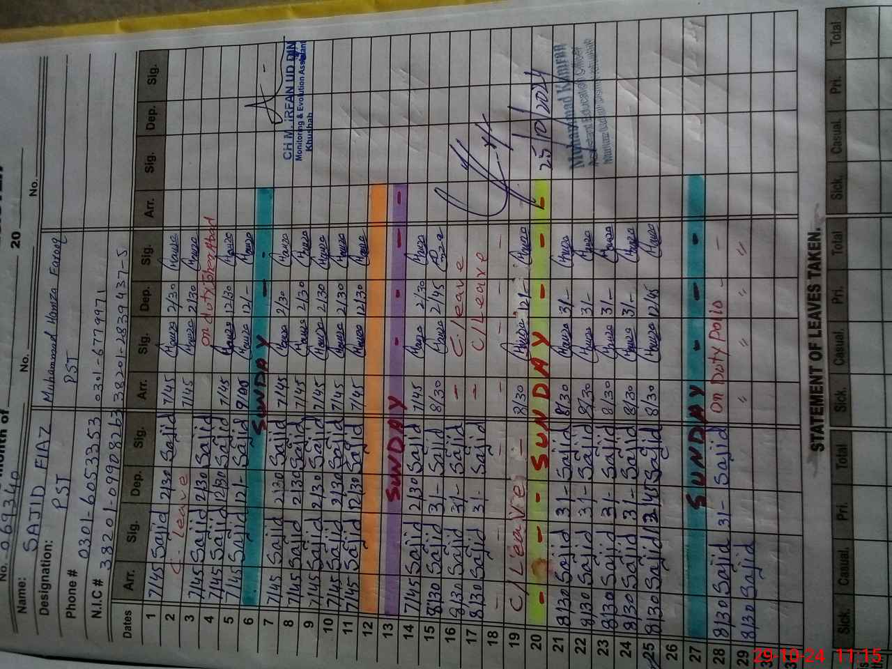 | CNIC | Full Name | Designation | R/C | Absence During Last Calender Month |