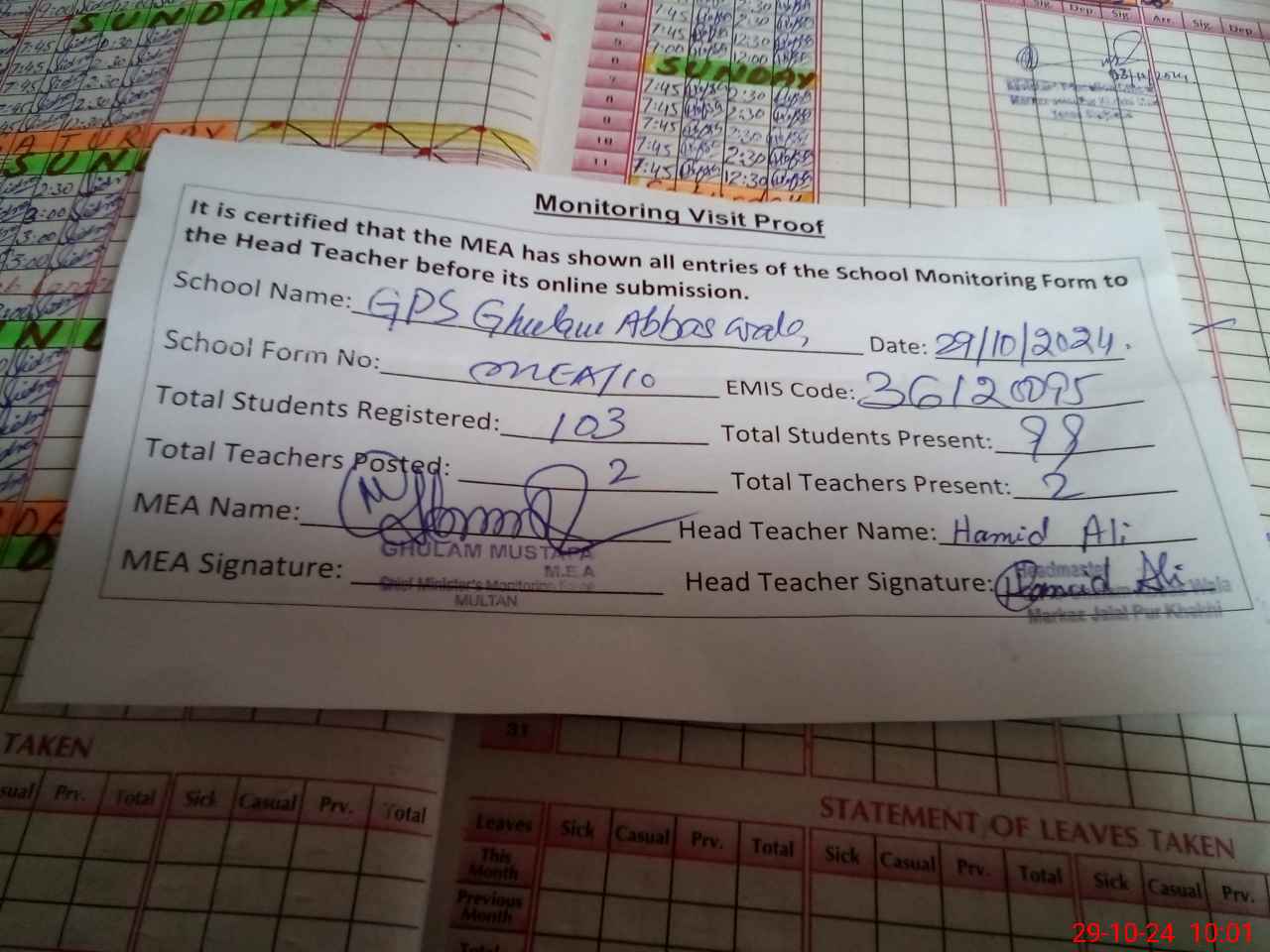 | Attendance Register | Head Teacher | MEA with School | Visit Proof |