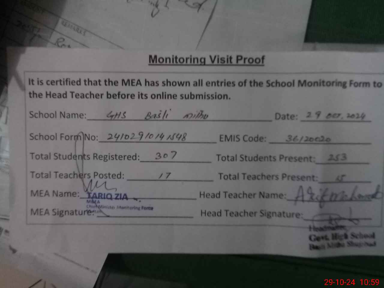 | Certified that this School was Inspected by the Undersigned MEA/DMO Today and the Information Stated Above is as Per Record. | |||||