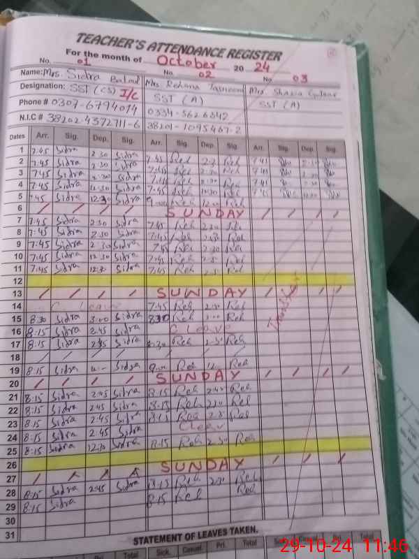 | CNIC | Full Name | Designation | R/C | Absence During Last Calender Month |