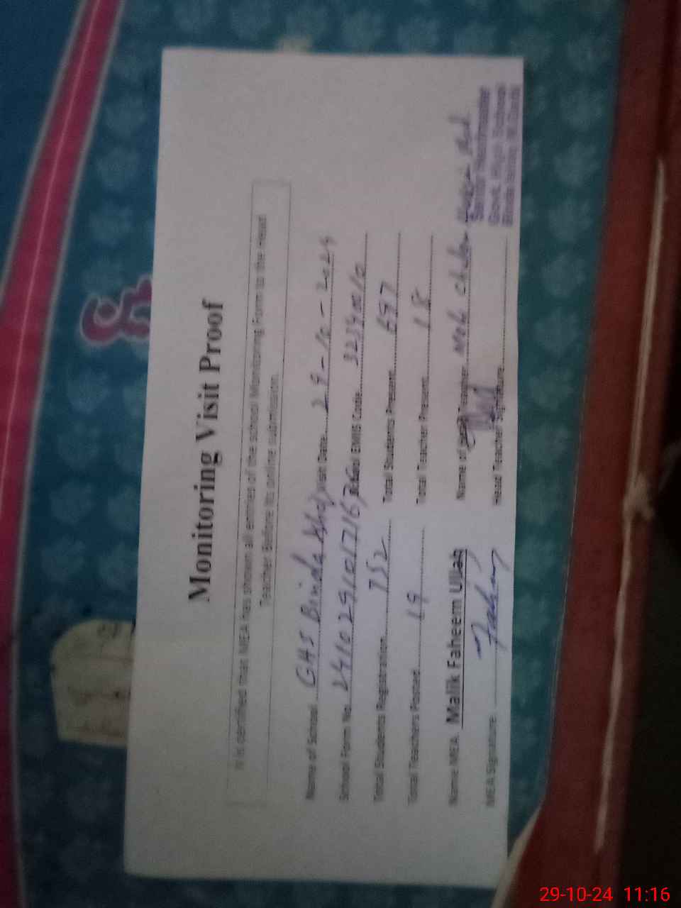 | Attendance Register | Head Teacher | MEA with School | Visit Proof |