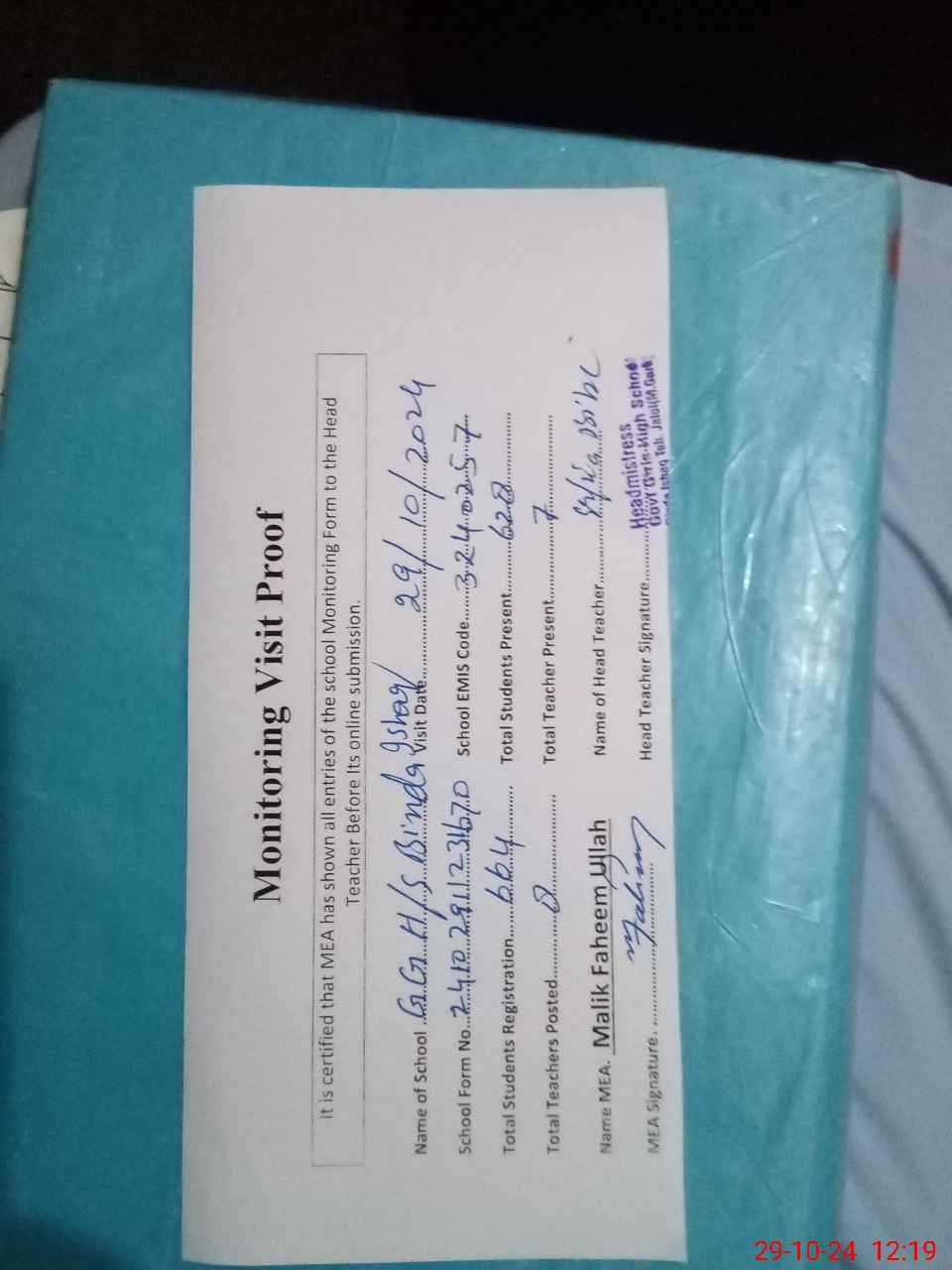 | Attendance Register | Head Teacher | MEA with School | Visit Proof |