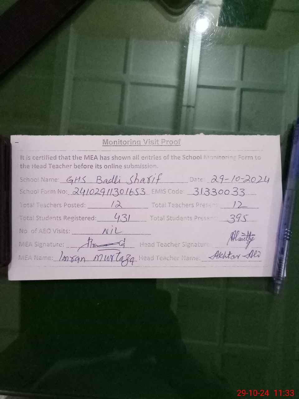 | Attendance Register | Head Teacher | MEA with School | Visit Proof |
