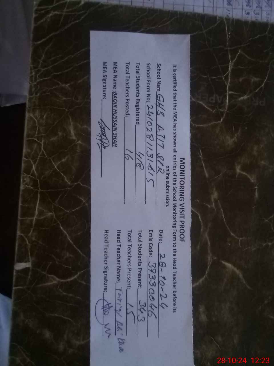| Attendance Register | Head Teacher | MEA with School | Visit Proof |