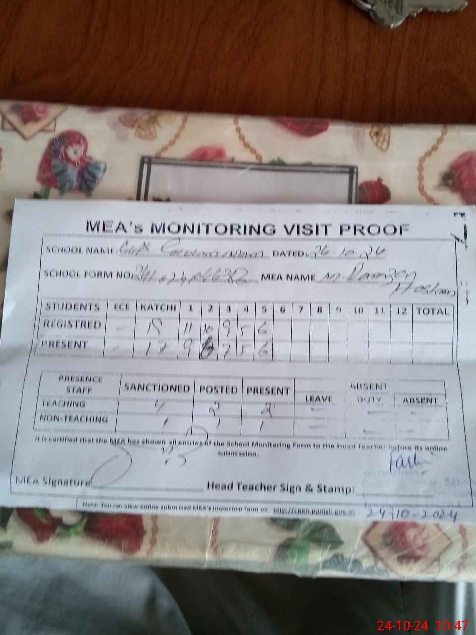 | Certified that this School was Inspected by the Undersigned MEA/DMO Today and the Information Stated Above is as Per Record. | |||||