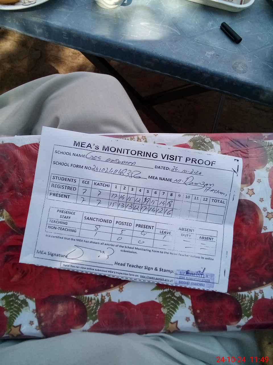 | Attendance Register | Head Teacher | MEA with School | Visit Proof |