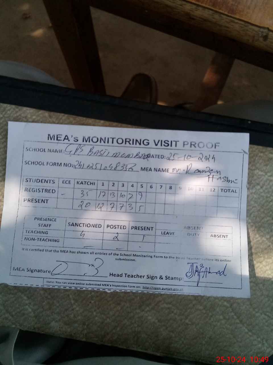 | Certified that this School was Inspected by the Undersigned MEA/DMO Today and the Information Stated Above is as Per Record. | |||||