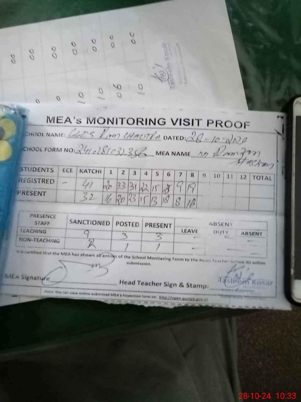 | Attendance Register | Head Teacher | MEA with School | Visit Proof |