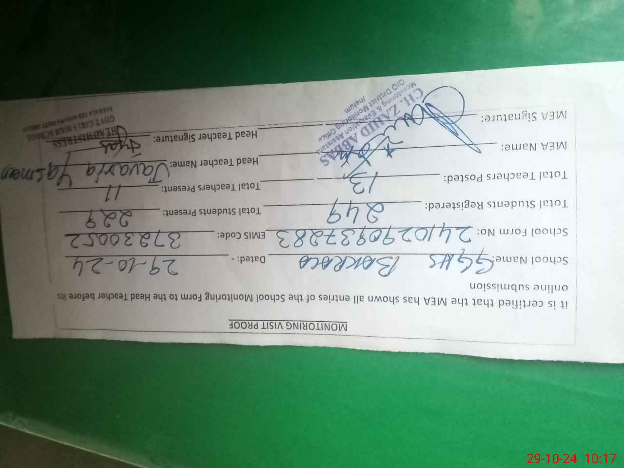 | Monitoring Date: 29-10-2024 | Start Time: 29-10-2024 09:37 AM | End Time: 29-10-2024 10:19 AM | Name of MEA: Za**** Ab**** | |