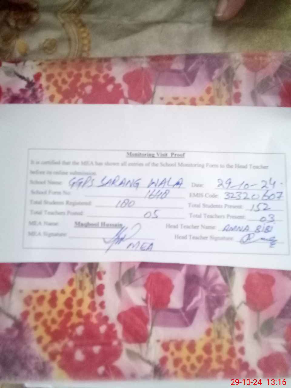 | EMIS Code: 32320607 | Name of School: GGPS SARANG WALA | |||