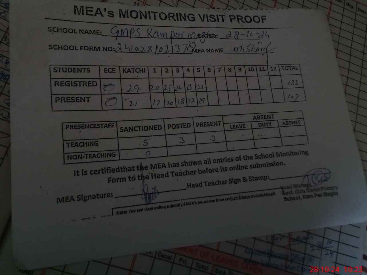 | Attendance Register | Head Teacher | MEA with School | Visit Proof |