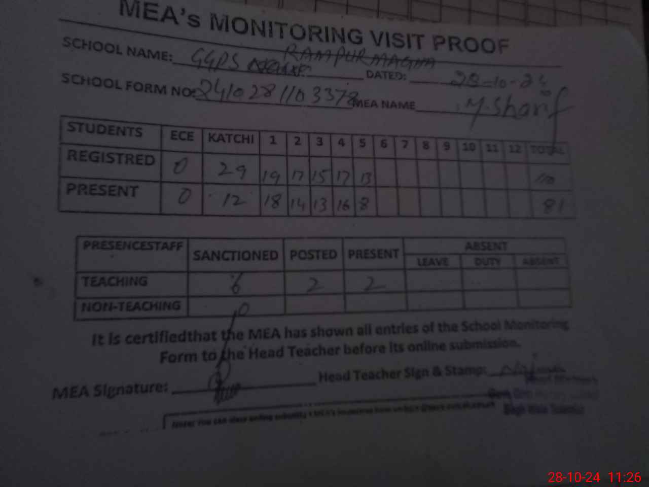 | Attendance Register | Head Teacher | MEA with School | Visit Proof |