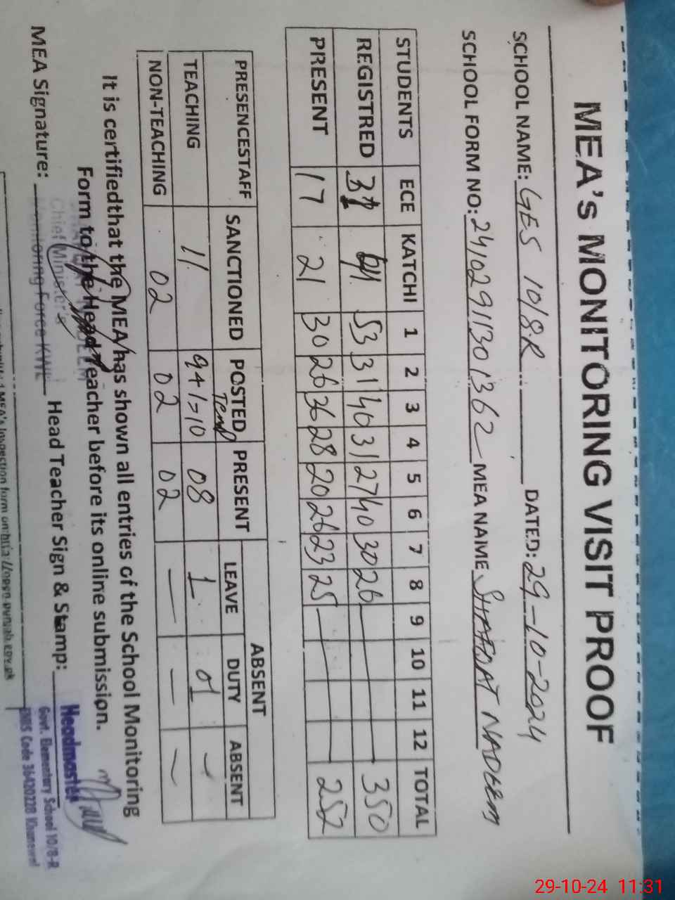 | Attendance Register | Head Teacher | MEA with School | Visit Proof |