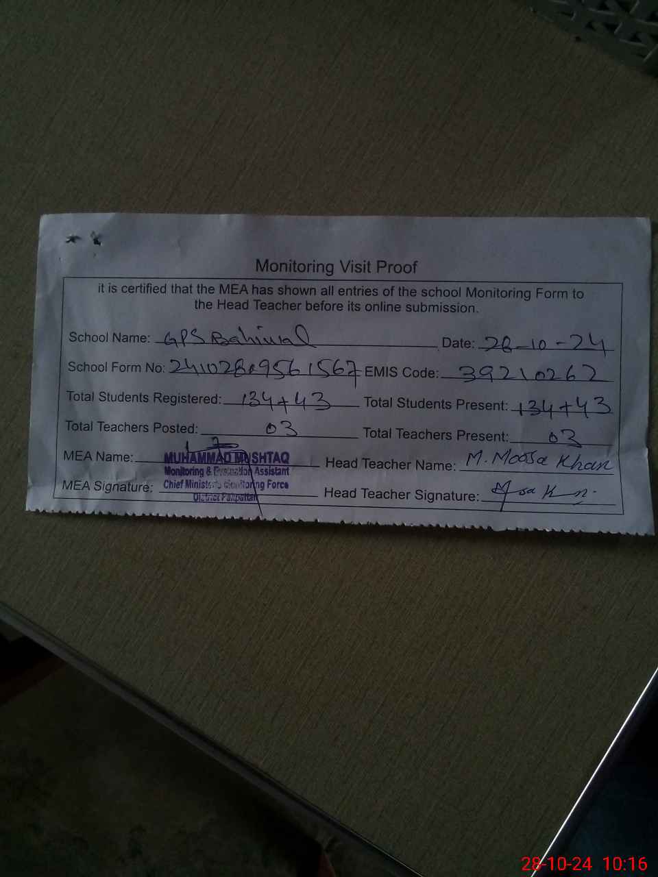| Name: Mu**** Mo**** Kh**** Designation: (School Headmaster's/Headmistress's) PST Phone/Cell Number: 03**** |