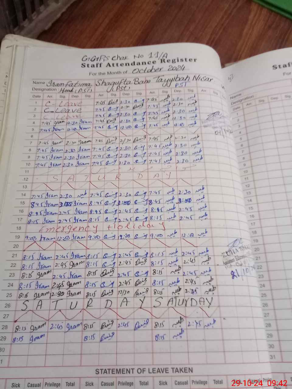 | Leave | Duty | Absent | Maternity | Medical | Ex- Pak |
