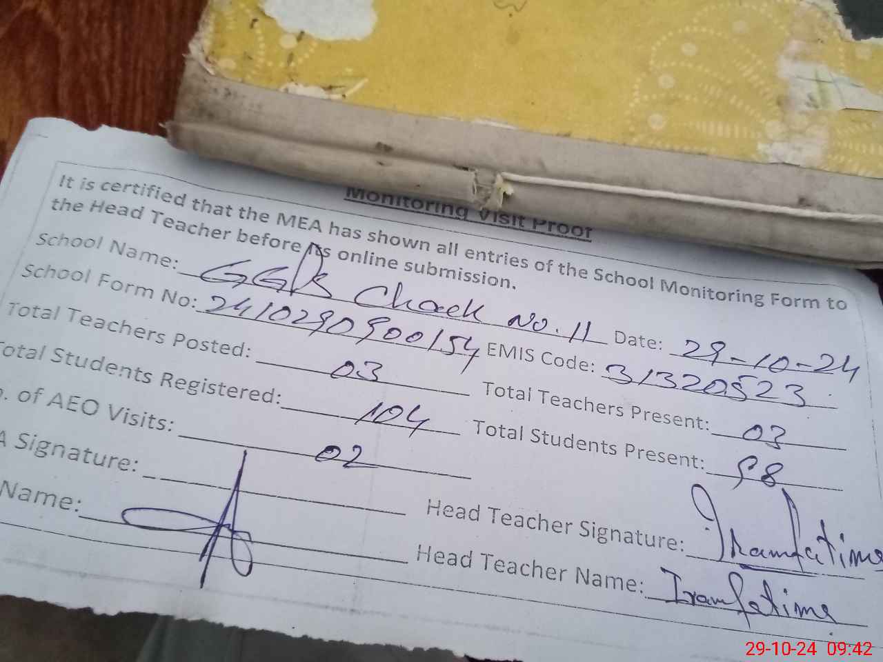 | Attendance Register | Head Teacher | MEA with School | Visit Proof |
