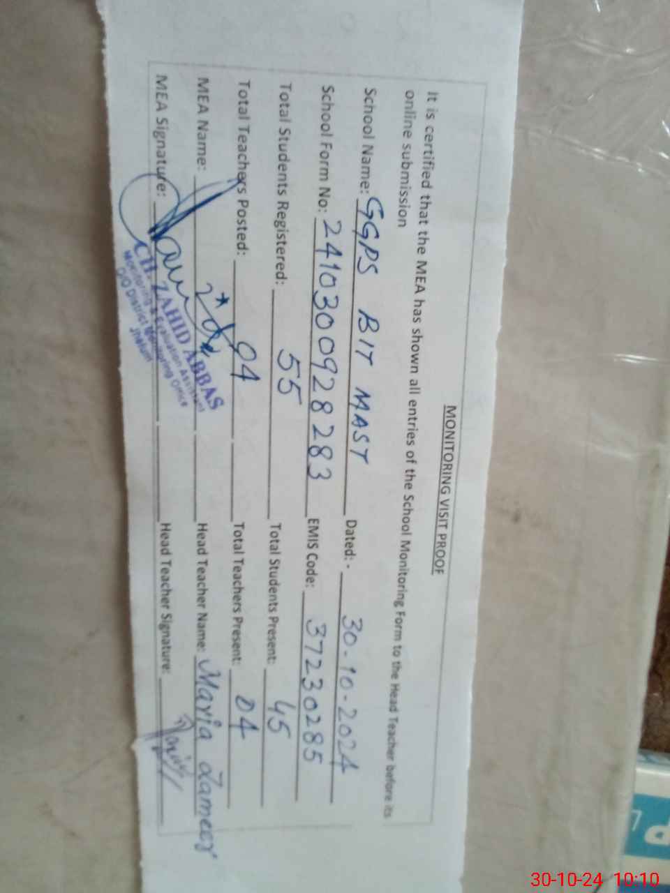 | Monitoring Date: 30-10-2024 | Start Time: 30-10-2024 09:28 AM | End Time: 30-10-2024 10:17 AM | Name of MEA: Za**** Ab**** | |