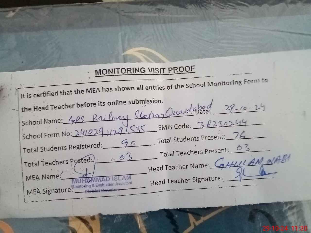 | EMIS Code: 38230244 | Name of School: GPS RAILWAY STATION QUAIDABAD | |||