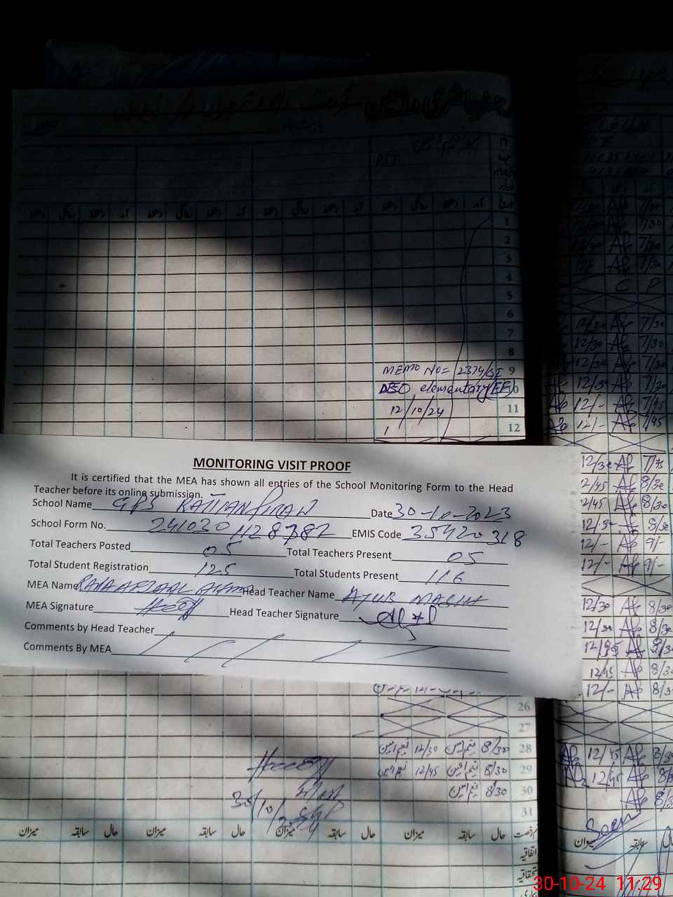 | Attendance Register | Head Teacher | MEA with School | Visit Proof |