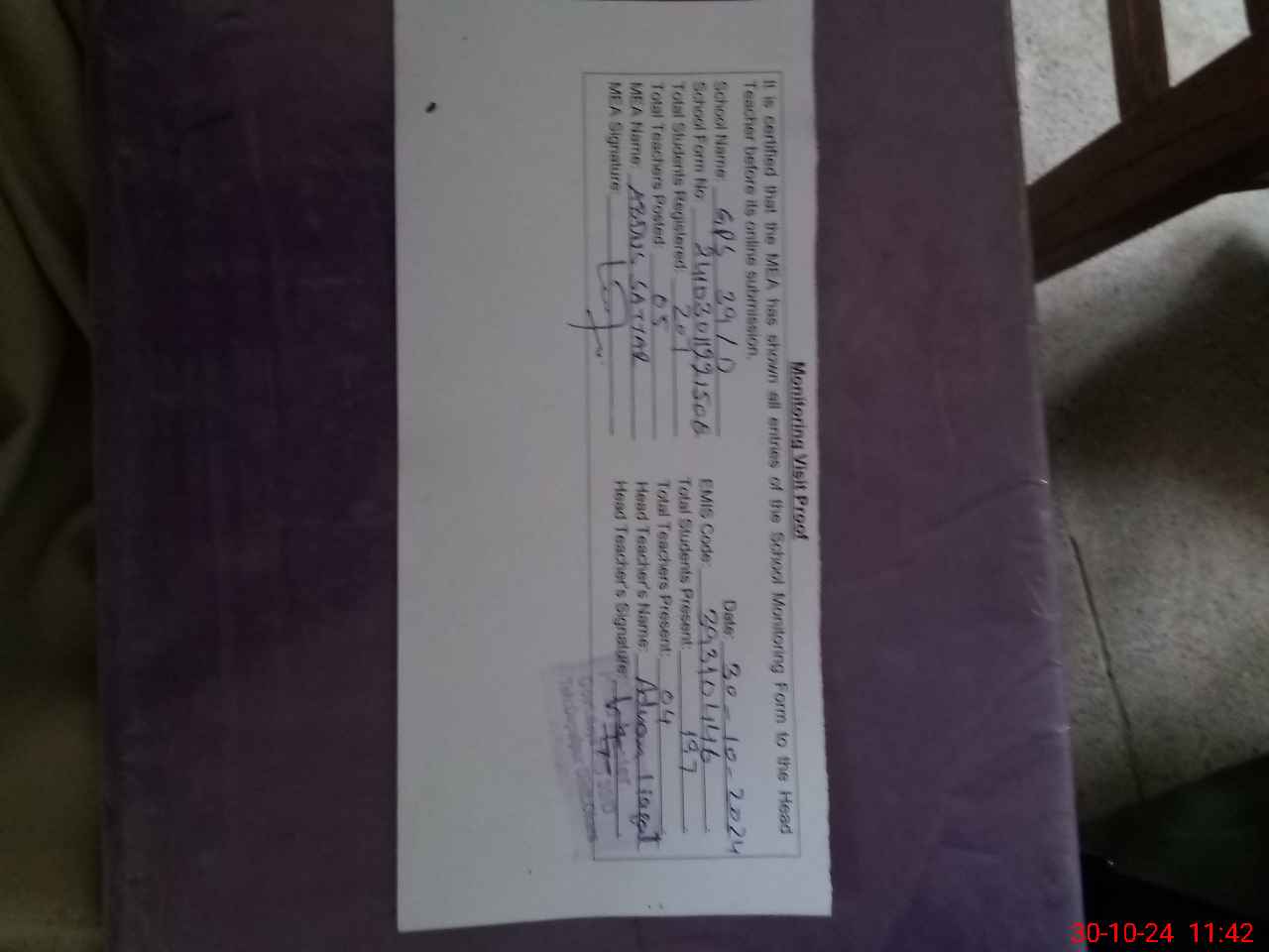 | Attendance Register | Head Teacher | MEA with School | Visit Proof |