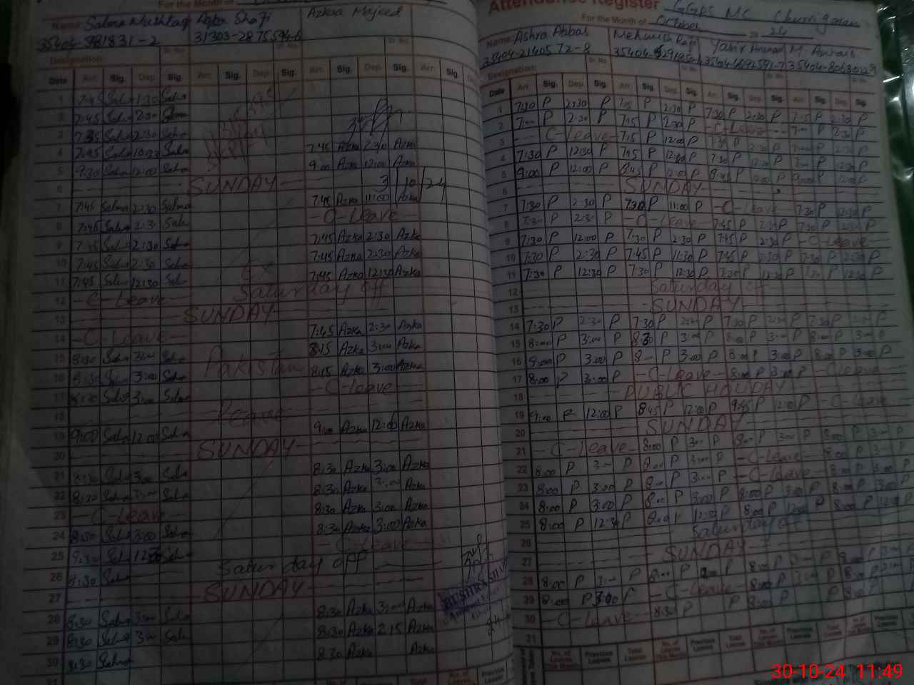 | CNIC | Full Name | Designation | R/C | Absence during last cal. month |
