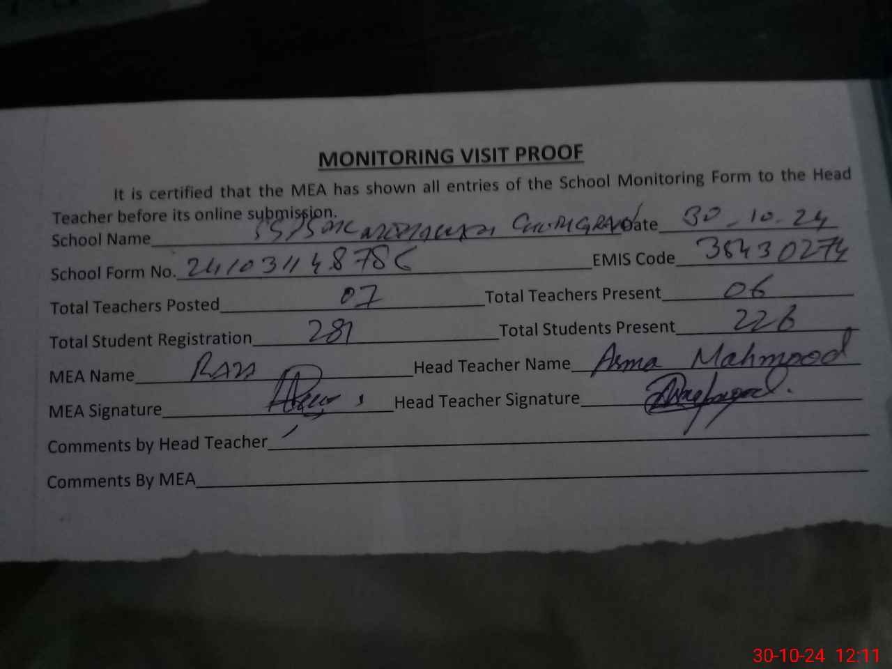 | Attendance Register | Head Teacher | MEA with School | Visit Proof |
