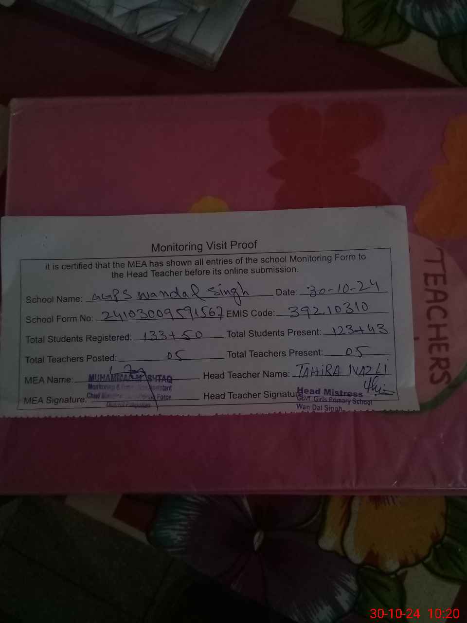 | Attendance Register | Head Teacher | MEA with School | Visit Proof |
