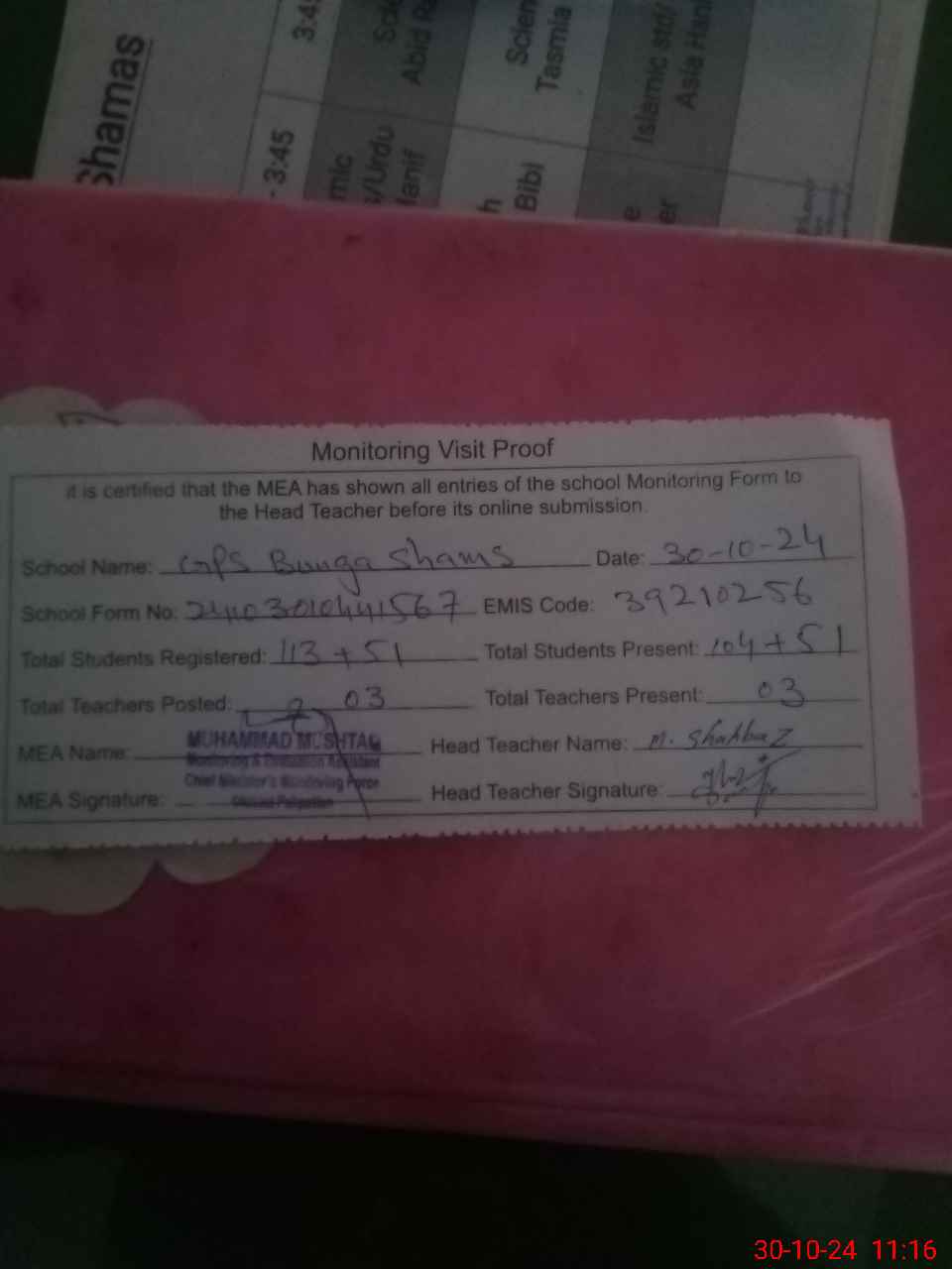 | Certified that this School was Inspected by the Undersigned MEA/DMO Today and the Information Stated Above is as Per Record. | |||||